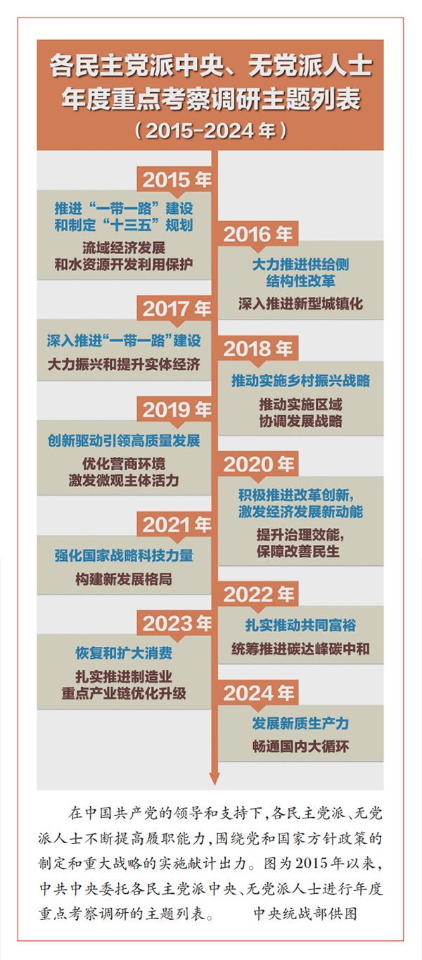 二是支持民主黨派、無黨派人士履職盡責(zé),為推進中國式現(xiàn)代化凝心聚力。要提高政黨協(xié)商質(zhì)量,各級黨委特別是領(lǐng)導(dǎo)干部帶頭增強協(xié)商意識,真誠務(wù)實開展協(xié)商,完善知情明政機制,健全協(xié)商反饋機制,為民主黨派和無黨派人士參與政黨協(xié)商提供保障。要健全議政建言機制,支持民主黨派和無黨派人士發(fā)揮人才、智力優(yōu)勢,完善集智聚力、激勵考評、建言獻策專報等機制,更好服務(wù)黨和政府科學(xué)民主決策。要有序開展民主監(jiān)督,健全會議監(jiān)督、完善書面監(jiān)督、推進專項監(jiān)督、開展檢查監(jiān)督、做好特約監(jiān)督,鼓勵民主黨派和無黨派人士講真話、建諍言。要拓展發(fā)揮優(yōu)勢作用的平臺載體,支持民主黨派和無黨派人士開展多種形式的社會服務(wù),協(xié)助做好凝聚共識、化解矛盾、維護穩(wěn)定等工作。要支持參加政協(xié)的民主黨派成員和無黨派人士通過參與專題調(diào)研、協(xié)商議政、視察考察,以及提交提案、大會發(fā)言、反映社情民意信息等方式提出意見、批評、建議,參加政協(xié)對外宣傳和交往活動。