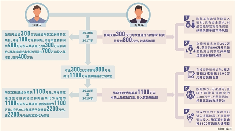 陳冠言:審查調(diào)查過程中,我們發(fā)現(xiàn)張曉天與陶某某的“合作投資”均有相關(guān)投資入股協(xié)議等書證予以證實,陶某某幫助張曉天代為保管的2200萬元,看似通過張曉天用其子名義“投資—獲利—再投資—再獲利”的行為,以“滾雪球”的方式逐漸累積而來,系張曉天的投資本金及利潤。但結(jié)合雙方證言及客觀情況,我們發(fā)現(xiàn)張曉天與陶某某“合作投資”實則分為三個部分: