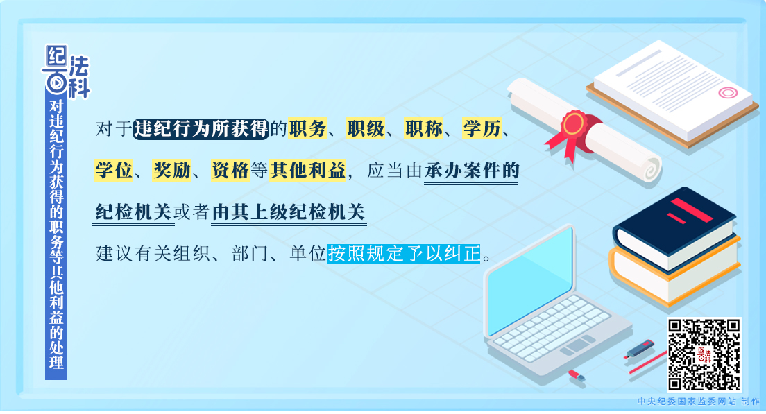 《中國共產(chǎn)黨紀(jì)律處分條例》第四十三條規(guī)定:對于違紀(jì)行為所獲得的職務(wù)、職級、職稱、學(xué)歷、學(xué)位、獎勵、資格等其他利益,應(yīng)當(dāng)由承辦案件的紀(jì)檢機(jī)關(guān)或者由其上級紀(jì)檢機(jī)關(guān)建議有關(guān)組織、部門、單位按照規(guī)定予以糾正。