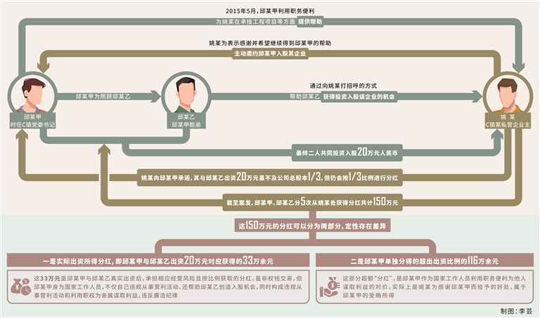 違反廉潔紀(jì)律。2015年5月,時任C鎮(zhèn)黨委書記的邱某甲為C鎮(zhèn)某私營企業(yè)主姚某在承接工程項目等方面提供幫助,姚某為表示感謝并希望繼續(xù)得到邱某甲的幫助,主動邀約邱某甲入股其實際控制的某私營企業(yè)。為照顧胞弟邱某乙,邱某甲通過向姚某打招呼的方式,幫助邱某乙也獲得投資入股該企業(yè)的機會,最終二人共同投資入股20萬元人民幣(幣種下同),邱某甲僅出資但未實際參與經(jīng)營。2018年至2022年,二人從上述企業(yè)按出資比例分紅共33萬余元。