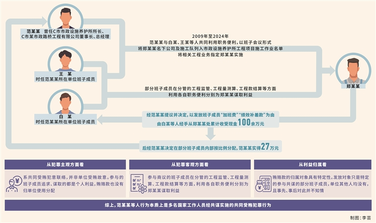 2009年至2024年,范某某與單位時任部分班子成員白某、王某等人共同利用職務便利,以班子會議形式,將鄭某某名下公司及施工隊列入市政設施養(yǎng)護所工程項目施工作業(yè)名單,將相關工程業(yè)務指定鄭某某實施,部分班子成員在分管的工程監(jiān)管、工程量測算、工程款結(jié)算等方面,利用各自職務便利分別為鄭某某謀取利益。2009年至2024年,經(jīng)范某某提議并決定,以發(fā)放班子成員“加班費”“績效補差款”為由,由班子成員白某等人經(jīng)手,從鄭某某處累計收受現(xiàn)金100余萬元,后經(jīng)范某某決定在部分班子成員內(nèi)部按比例分配,范某某實得27萬元。