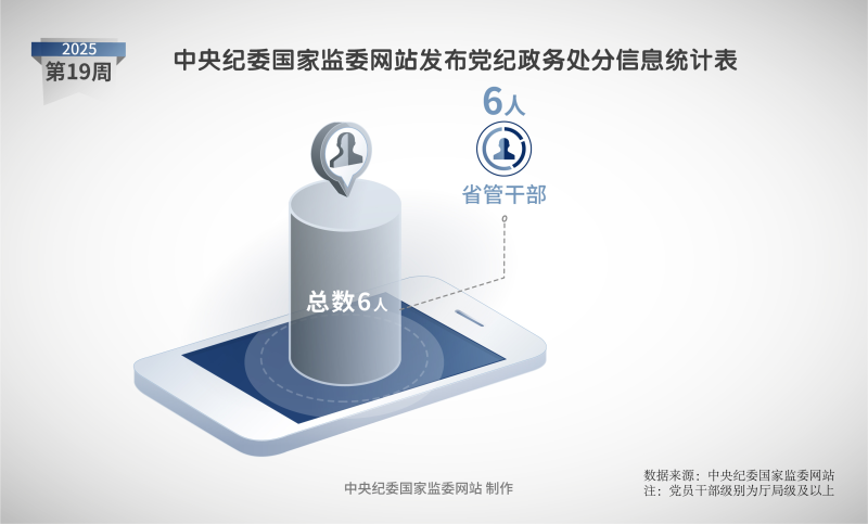 2025年第19周,中央紀(jì)委國家監(jiān)委網(wǎng)站共發(fā)布6條黨紀(jì)政務(wù)處分信息,均為省管干部。