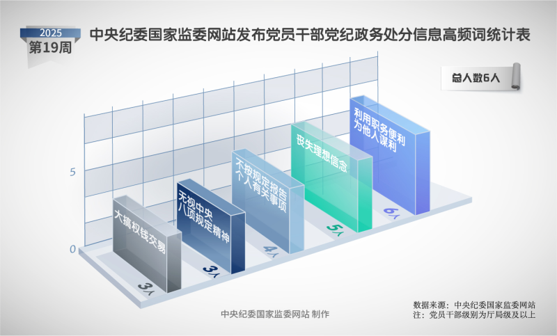 2025年第19周,在中央紀(jì)委國家監(jiān)委網(wǎng)站發(fā)布的6條黨紀(jì)政務(wù)處分通報(bào)中,“喪失理想信念”“不按規(guī)定報(bào)告?zhèn)人有關(guān)事項(xiàng)”“利用職務(wù)便利為他人謀利”“無視中央八項(xiàng)規(guī)定精神”“大搞權(quán)錢交易”是高頻詞。
