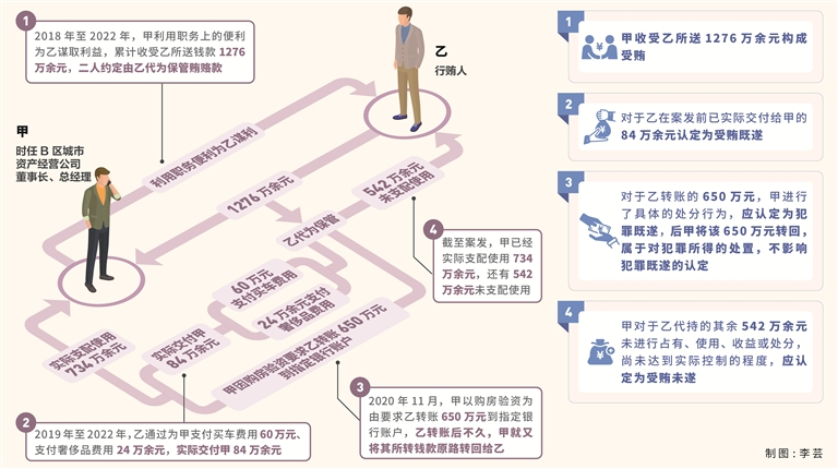 在行賄人代持賄賂款物案件中,受賄人主觀上已具有權錢交易的故意,但由于形式上賄賂款物未交付,故要全面結合證據分析受賄人是否已對財物實現控制,以確保主客觀相一致。本案中,甲利用其作為國有企業(yè)董事長、總經理職務上的便利為乙謀取巨額利益,收受乙所送款項1276萬余元,并約定該款項由乙代為保管。至案發(fā)時,乙通過為甲支付買車費用60萬元、支付奢侈品費用24萬余元,已實際交付甲84萬余元,此84萬余元當然為受賄既遂。此外,甲因自身買房驗資需要,數次安排乙從代其保管的款項中予以提取,2020年11月23日至26日,乙接受甲安排轉賬650萬元到其指定賬戶,此時,甲已具有對該650萬元完全的管理權和支配權,該650萬元應當認定為犯罪既遂,甲雖于2020年11月30日至2020年12月3日陸續(xù)將該650萬元轉回匯款賬戶,但這屬于甲對其犯罪所得的自行處置,并不影響其受賄犯罪既遂的認定。此外,甲還以同樣方式,分別讓乙轉賬300萬元、200萬元,考慮到這兩次甲調用金額均未超過此前轉回的650萬元,因此,對其受賄既遂數額不作累計計算。綜上,對甲已經實際支配使用的734萬余元應認定為犯罪既遂。