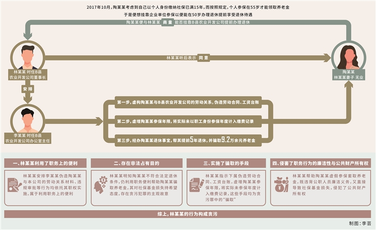 貪污罪。2017年10月,林某某妻子陶某某(無業(yè),另案處理)考慮到自己以個(gè)人身份繳納社保已滿15年,而按照規(guī)定,個(gè)人參保在55歲才能領(lǐng)取養(yǎng)老金,于是便想掛靠企業(yè)單位參保,以便能在50歲辦理退休、提前享受退休待遇;诖,陶某某便與林某某商量能否掛靠B縣農(nóng)業(yè)開發(fā)公司提前辦理退休,林某某聽后表示同意,并利用擔(dān)任該公司董事長(zhǎng)的職務(wù)便利,在明知陶某某不符合提前退休條件的情況下,安排時(shí)任公司辦公室主任李某某(另案處理)虛構(gòu)勞動(dòng)關(guān)系,為陶某某以該公司職工身份辦理退休事宜。手續(xù)辦理過程中,李某某按林某某的安排,偽造B縣農(nóng)業(yè)開發(fā)公司與陶某某的《勞動(dòng)合同書》,經(jīng)林某某本人簽字后加蓋公司合同專用章,陶某某憑該合同在B縣人力資源和社會(huì)保障局進(jìn)行勞動(dòng)合同鑒證。完成鑒證后,陶某某順利以B縣農(nóng)業(yè)開發(fā)公司職工身份參保,當(dāng)年度公司為其繳納職工養(yǎng)老保險(xiǎn)、工傷保險(xiǎn)、失業(yè)保險(xiǎn)、醫(yī)療保險(xiǎn)共計(jì)7649.76元。其間,陶某某從未在B縣農(nóng)業(yè)開發(fā)公司上班,也未向公司補(bǔ)繳為其繳納的社保費(fèi)用。