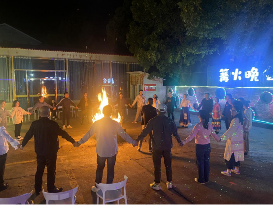 夜幕降臨,大家搬好桌椅、發(fā)放物料,在訓(xùn)練場地中央點燃慶祝的篝火。涼風(fēng)拂過場地,音響師調(diào)出美妙的音符,大家也按捺不住舞動的腳步。
